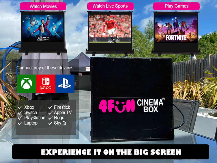 It's all Plug and Play and ready to go! Simply insert a DVD into the DVD player or connect your laptop, gaming console, Amazon Firestick, Apple TV, Roku Stick, Playstation, XBox or any HDMI streaming device to the HDMI switch inside the Cinema Box and watch your favourite films or play your favourite games on the big screen.