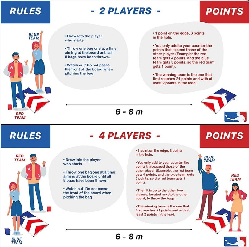 The objective is to aim at the hole of the opponent's board with the red or blue bags. Players take turns throwing their bags and the first one to put all his bags in wins the game. The 2 boards must be 6 - 8m apart and the players must throw from behind their board.