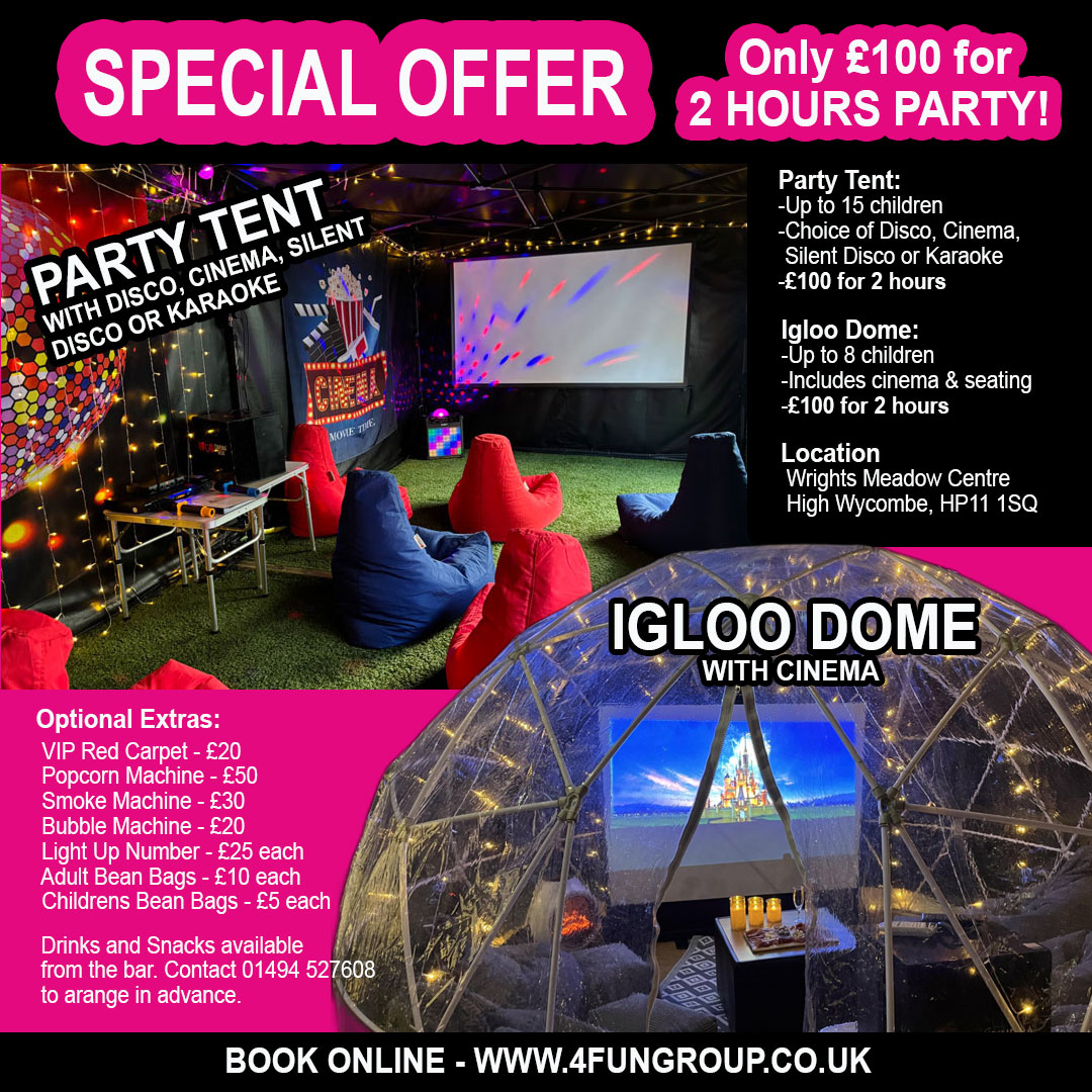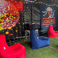 Price includes equipment of choice (Cinema, Disco, Karaoke, Silent Disco or Gaming) and 4 bean bags.